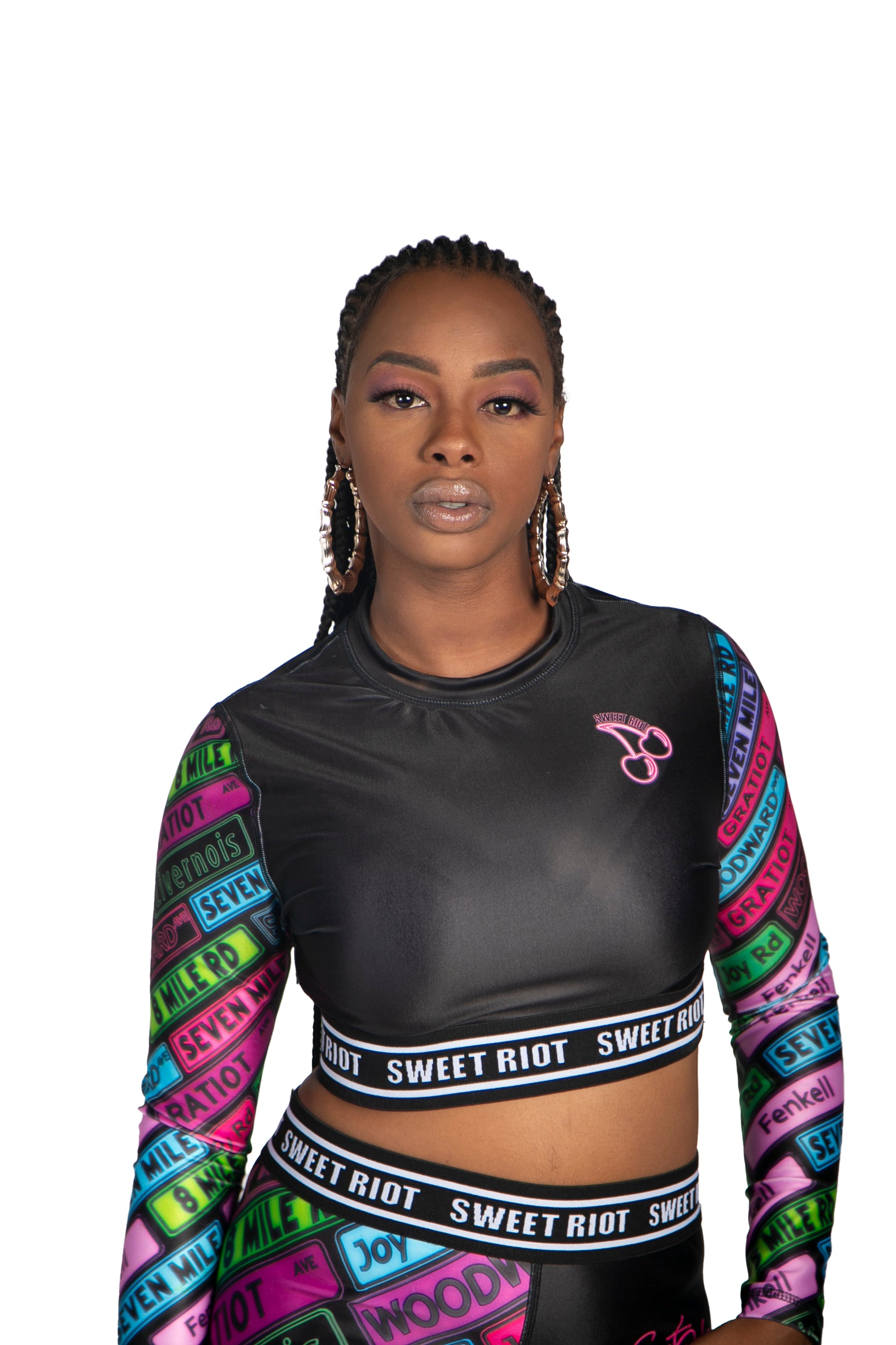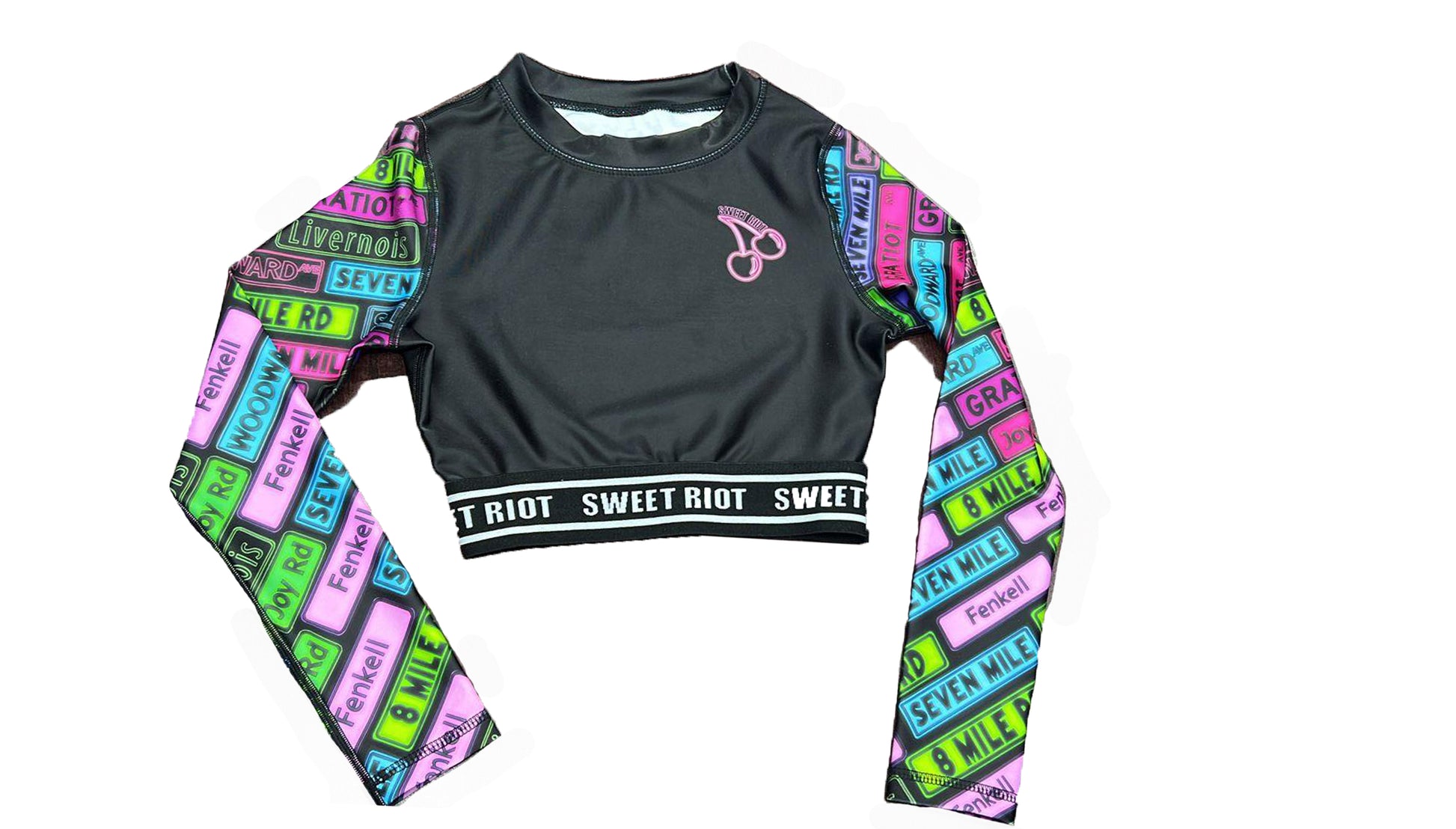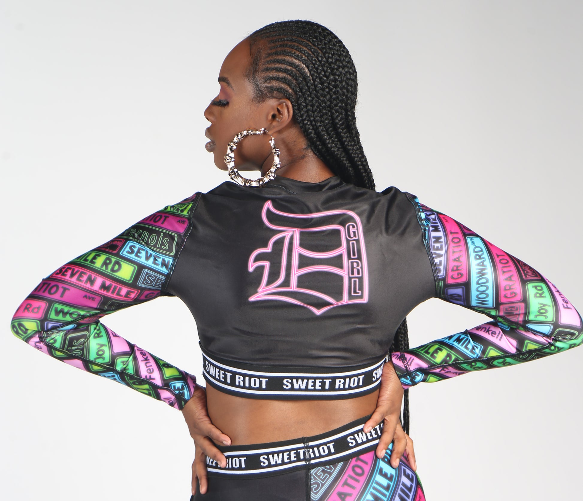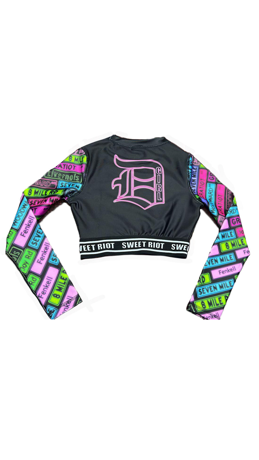 The D-girl Ambition crop top truly brings out the Detroit in you. The crop top features historic street names in bright neon colors with the D-Girl logo on the back. Detailed with a logo band around the bottom of the top. This piece will be the topic of discussion amongst your friends.